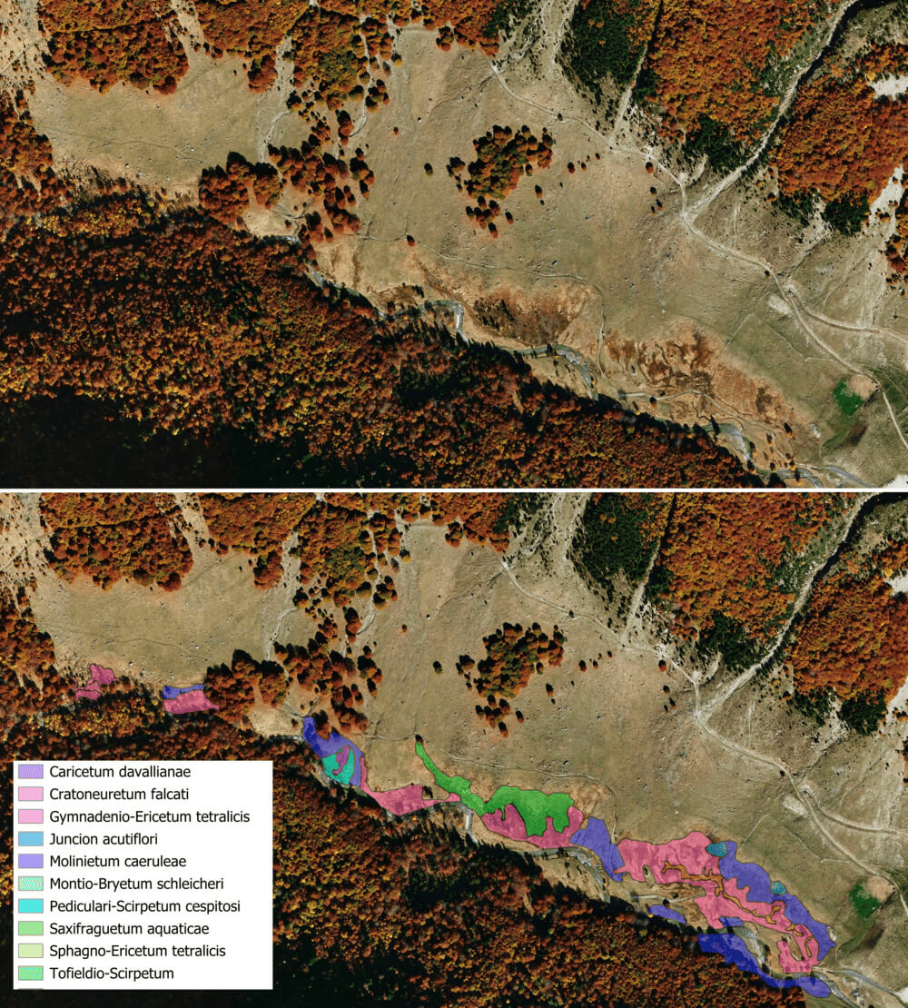 Aereal view of the Pleta de Molières Peatland, with the different habitats coloured according to the legend